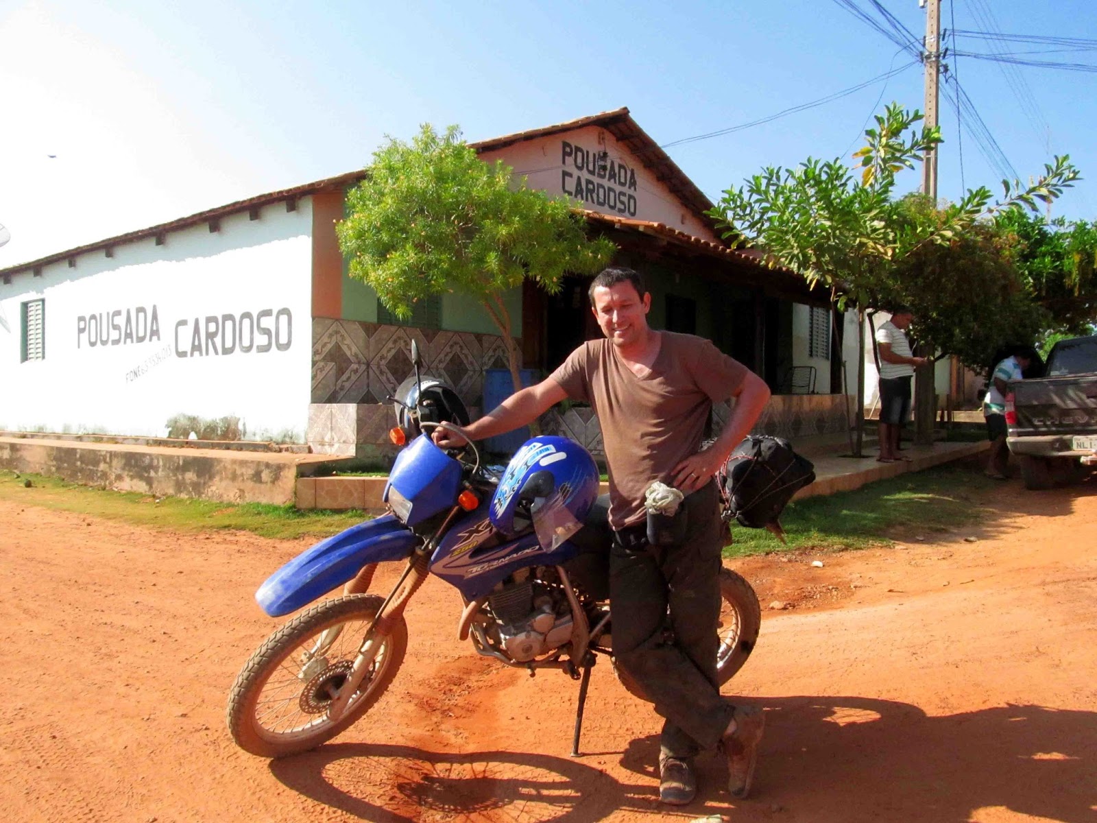 Sofremos, mas chegamos! Já estava escuro quando finalmente descemos em Mateiros, com a bunda quadrada, as pernas dormentes, o queixo duro dos solavancos do capacete, os cílios com quilos de poeira acumulada. E olha a coincidência: conseguimos nos hospedar na mesma pousada (Pousada do Cardoso) em que o Renato esteve há 15 anos. Tudo simples, mas bem confortável e limpinho. Outra salvação foi a comida caseira da Dona Rosa. Um frango assado com macarronada e mandioca frita foi a salvação da lavoura.